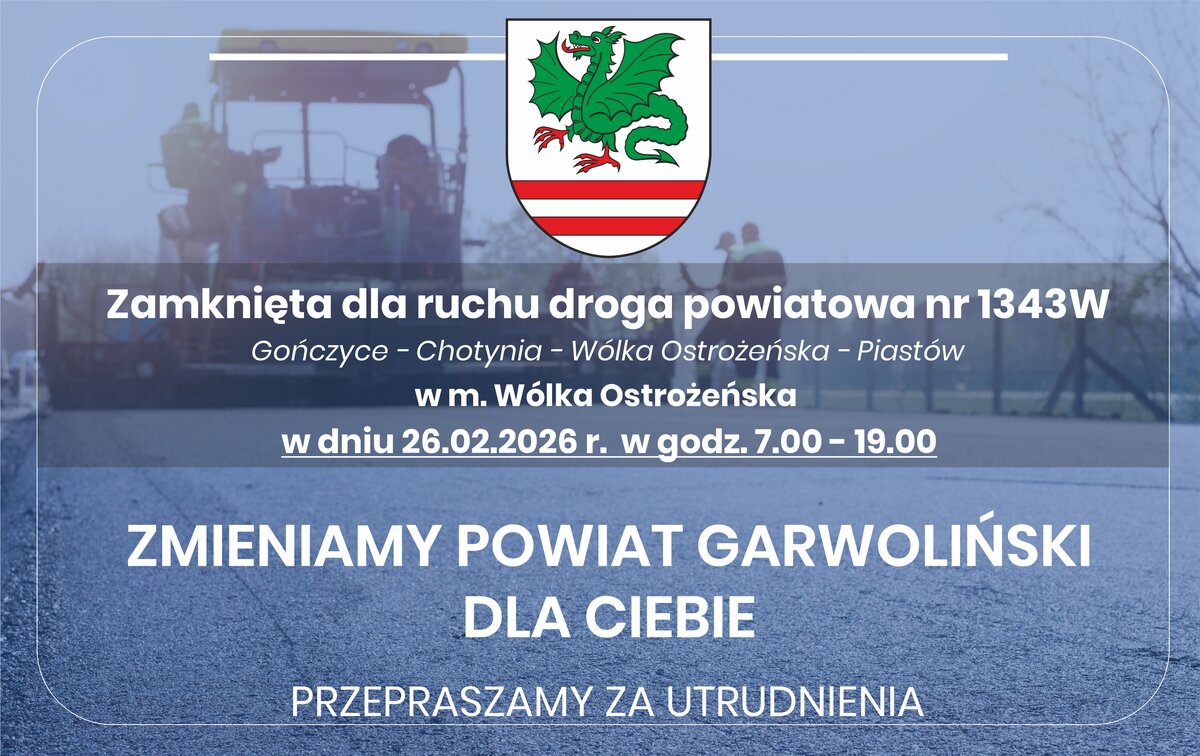 Powiatowy Zarząd Dróg w Garwolinie informuje, że w dniu 26.02.2026 r. od godziny 7:00 do godziny 19:00 zostanie zamknięta dla ruchu droga powiatowa Nr 1343W Gończyce - Chotynia - Wólka Ostrożeńska - Piastów w miejscowości Wólka Ostrożeńska.