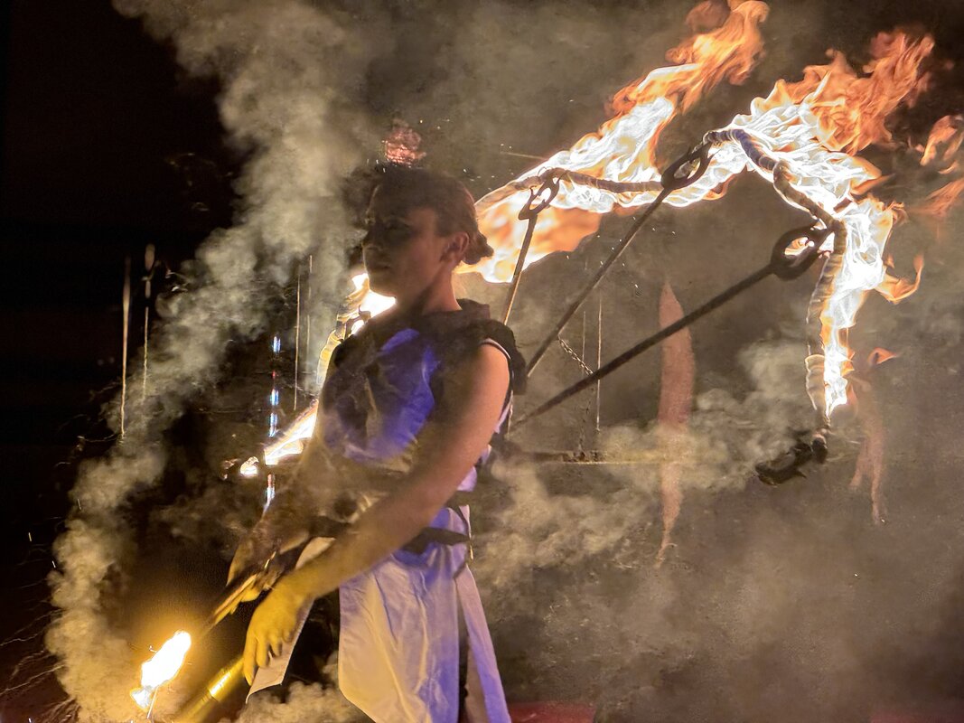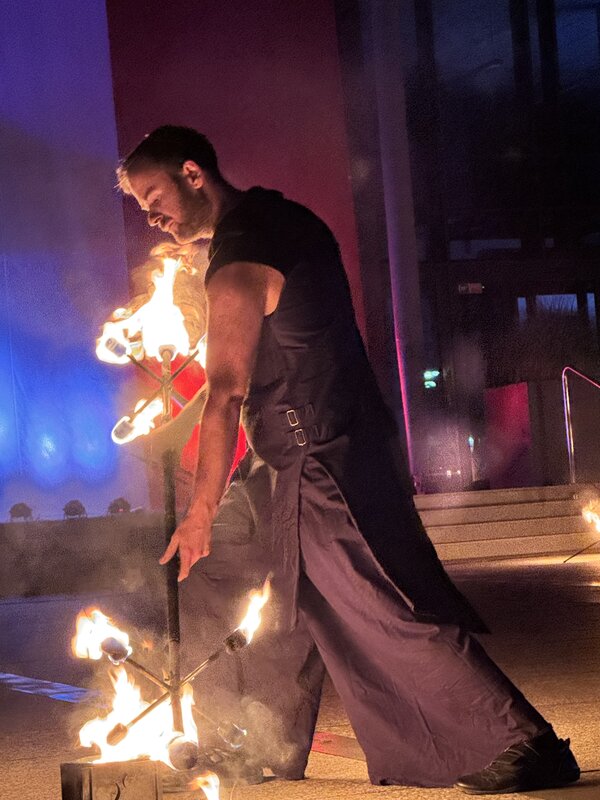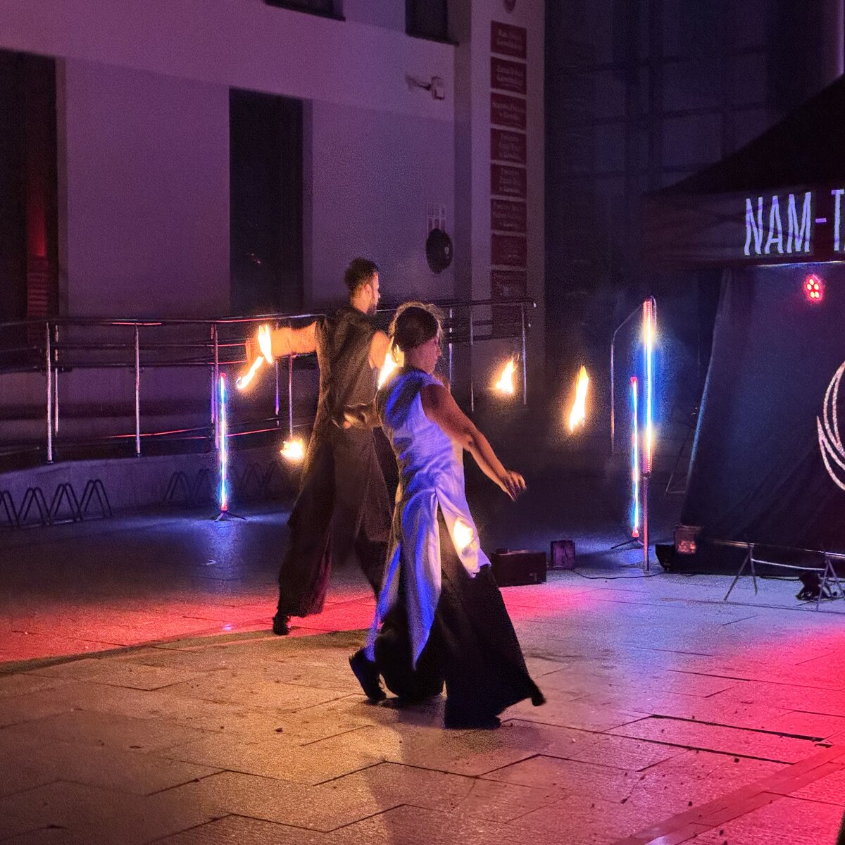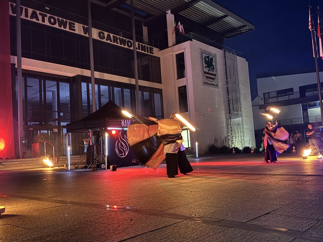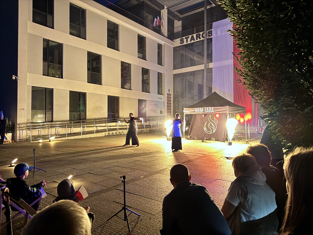 Kiedy zapadł zmrok, nadszedł kulminacyjny moment wieczoru – WHITE FIRESHOW – widowisko światła, ognia i dźwięku, które zaparło dech w piersiach. Artyści z ogromnym kunsztem zaprezentowali poruszające, symboliczne show, które – przy akompaniamencie muzyki – opowiedziało emocjonalną historię walki, nadziei i poświęcenia. Migoczące płomienie, taniec i efekty świetlne sprawiły, że plac przed starostwem zamienił się na chwilę w scenę wzruszenia i zadumy.