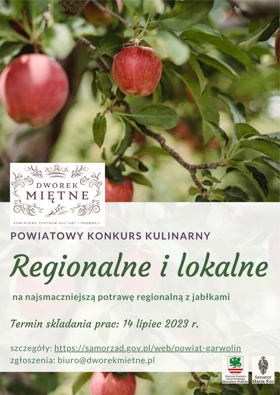 Powiatowe Centrum Kultury i Promocji w Miętnem zaprasza Koła Gospodyń Wiejskich z Powiatu Garwolińskiego do wzięcia udziału w konkursie kullinarnym „Regionalne i lokalne” na najsmaczniejszą potrawę z jabłkami.