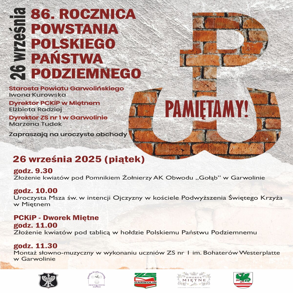 Starosta Powiatu Garwolińskiego Iwona Kurowska, Dyrektor Powiatowego Centrum Kultury i Promocji w Miętnem Elżbieta Radziej oraz Dyrektor Zespołu Szkół nr 1 w Garwolinie Marzena Tudek zapraszają mieszkańców Powiatu Garwolińskiego do wspólnego uczczenia 86. rocznicy powstania Polskiego Państwa Podziemnego.