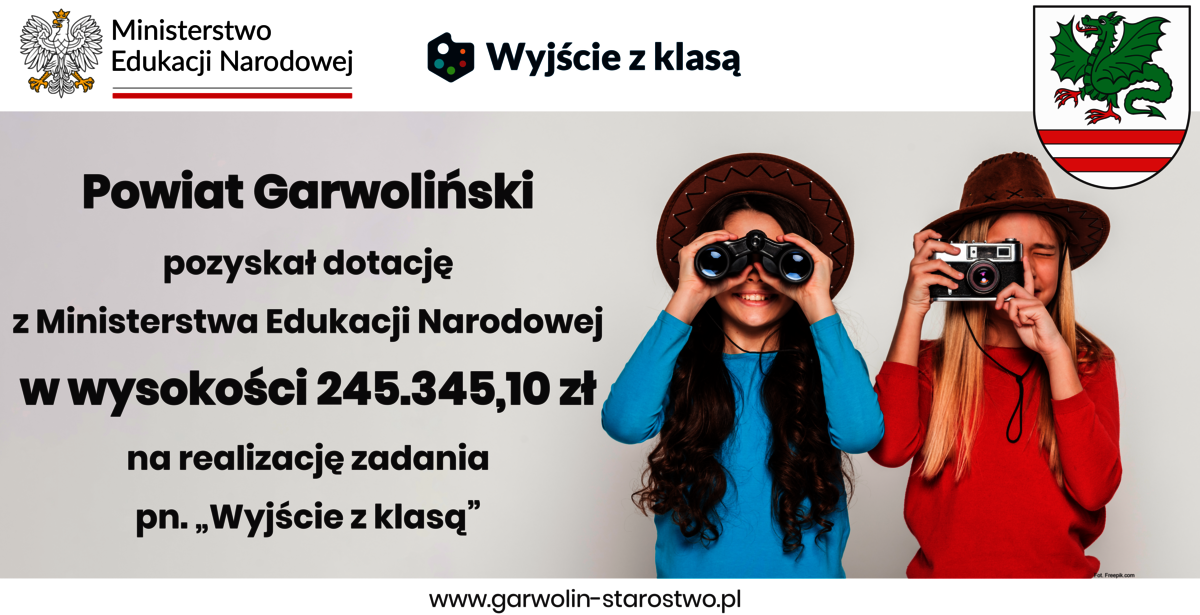 W dniu 20.11.2025 r. Powiat Garwoliński podpisał umowę z Ministerstwem Edukacji Narodowej na realizację projektu pn. „Wyjście z klasą”. Kwota dotacji wynosi 245 345,10 zł.