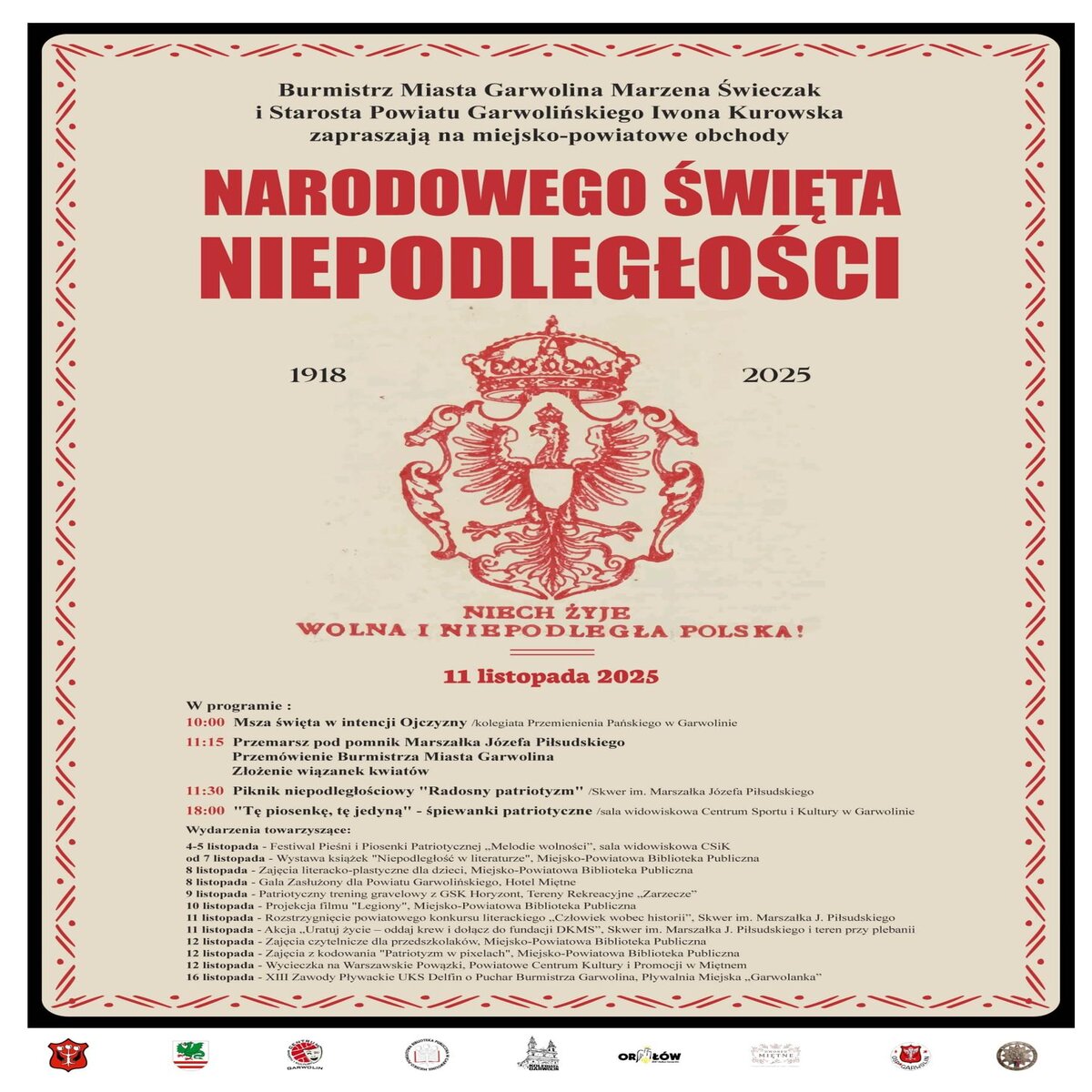 Serdecznie zapraszamy na miejsko-powiatowe obchody Narodowego Święta Niepodległości, które odbędą się 11 listopada 2025 r.