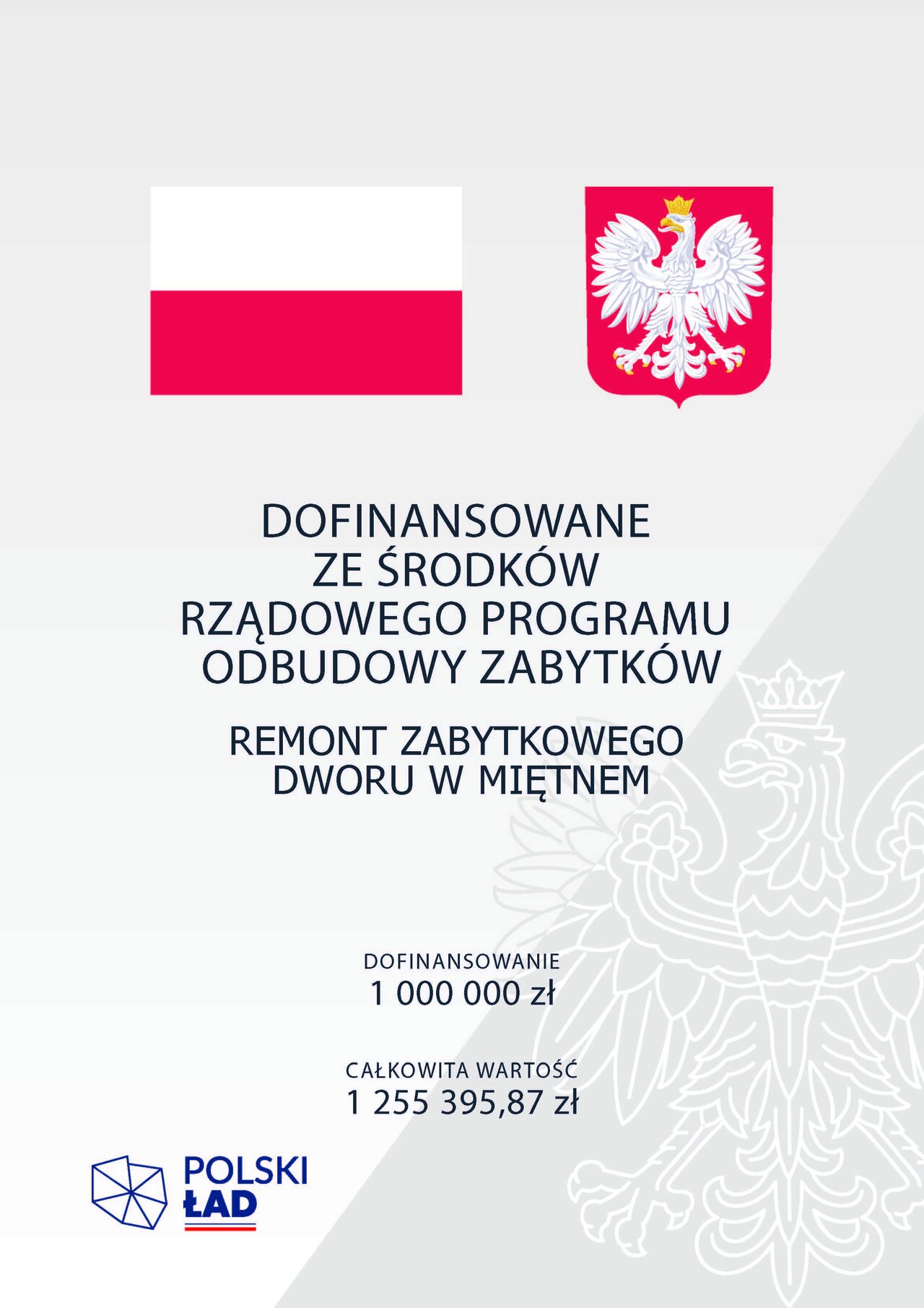 Na realizację inwestycji Powiat otrzymał promesę w wysokości 1 000 000,00 zł (słownie: jeden milion złotych) z Rządowego Programu Odbudowy Zabytków na realizację projektu pn. „REMONT ZABYTKOWEGO DWÓRU W MIĘTNEM”.